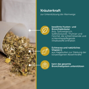 Bewährte Rezeptur ausgewählter Kräuter zur Unterstützung der Atemwege.