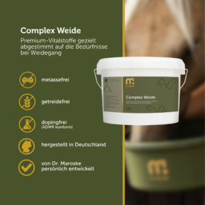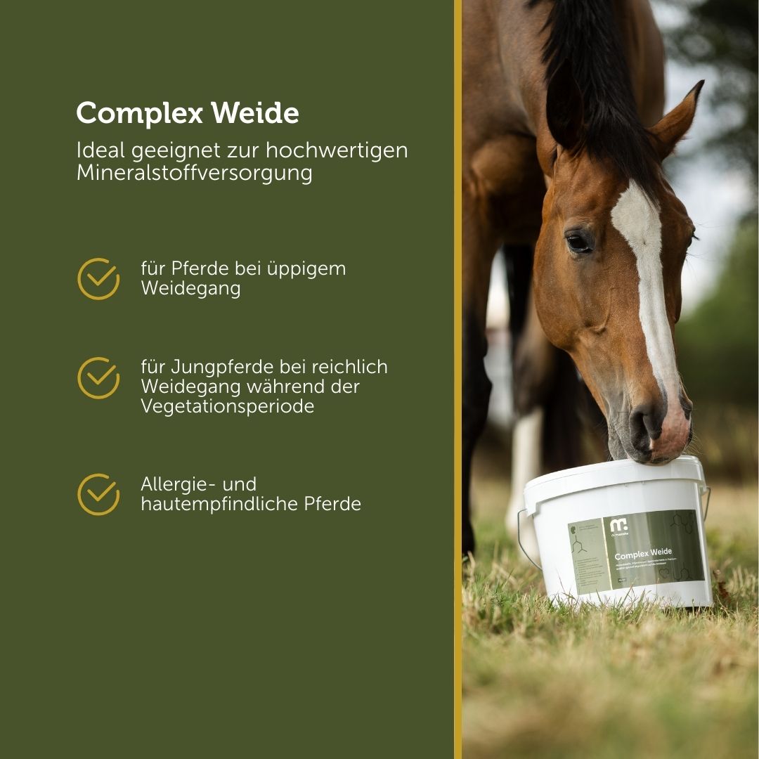 Während der Weidezeit ist der Bedarf an Vitamin A, Vitamin D3 und Vitamin E bei gutem Grasangebot (mehr als ca. 3 h Grasaufnahme) gesichert. Leider ist jedoch die Versorgung an Spurenelementen wie Zink, Kupfer, Mangan, Selen und Jod im Gras nicht höher enthalten als im Heu und oft im Mangel. Auch Mineralstoffe stehen bei Weidegang je nach Grasaufwuchs nicht immer optimal zur Verfügung. Deshalb bietet Complex Weide eine optimale Versorgung an Mineralstoffen und organischen Spurenelementen für höchste Bioverfügbarkeit. Zusätzlich ist das Präparat mit B-Vitaminen, Vitamin C, Biotin und Zink ausgestattet, um Haut, Fell, Stoffwechsel und Hufe zu unterstützen. Complex Weide bietet somit eine Rundumversorgung in Premiumqualität. In pelletierter Form für eine einfache Aufnahme. Frei von Aromen, Luzerne und Getreide, zuckerarm und stärkefrei.
