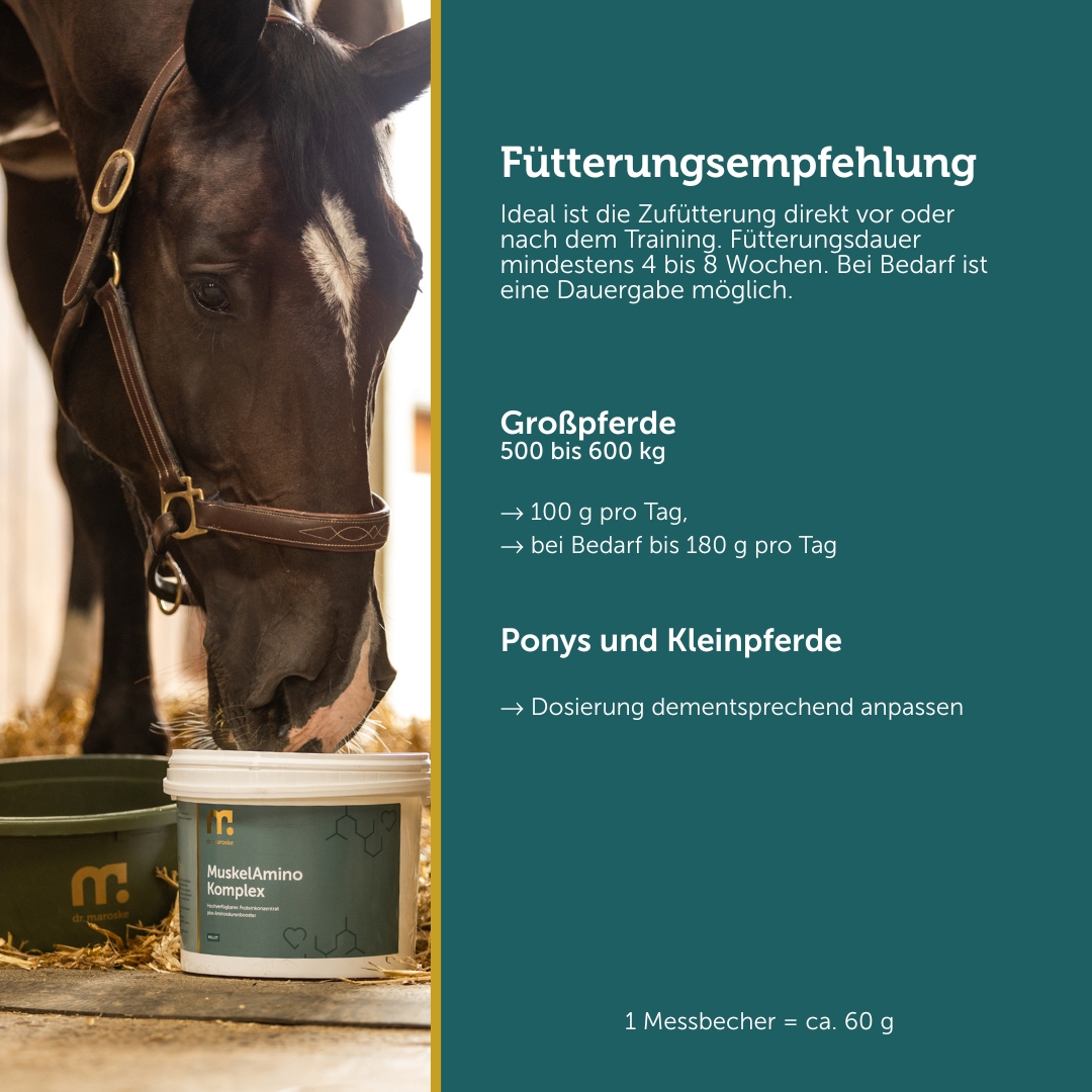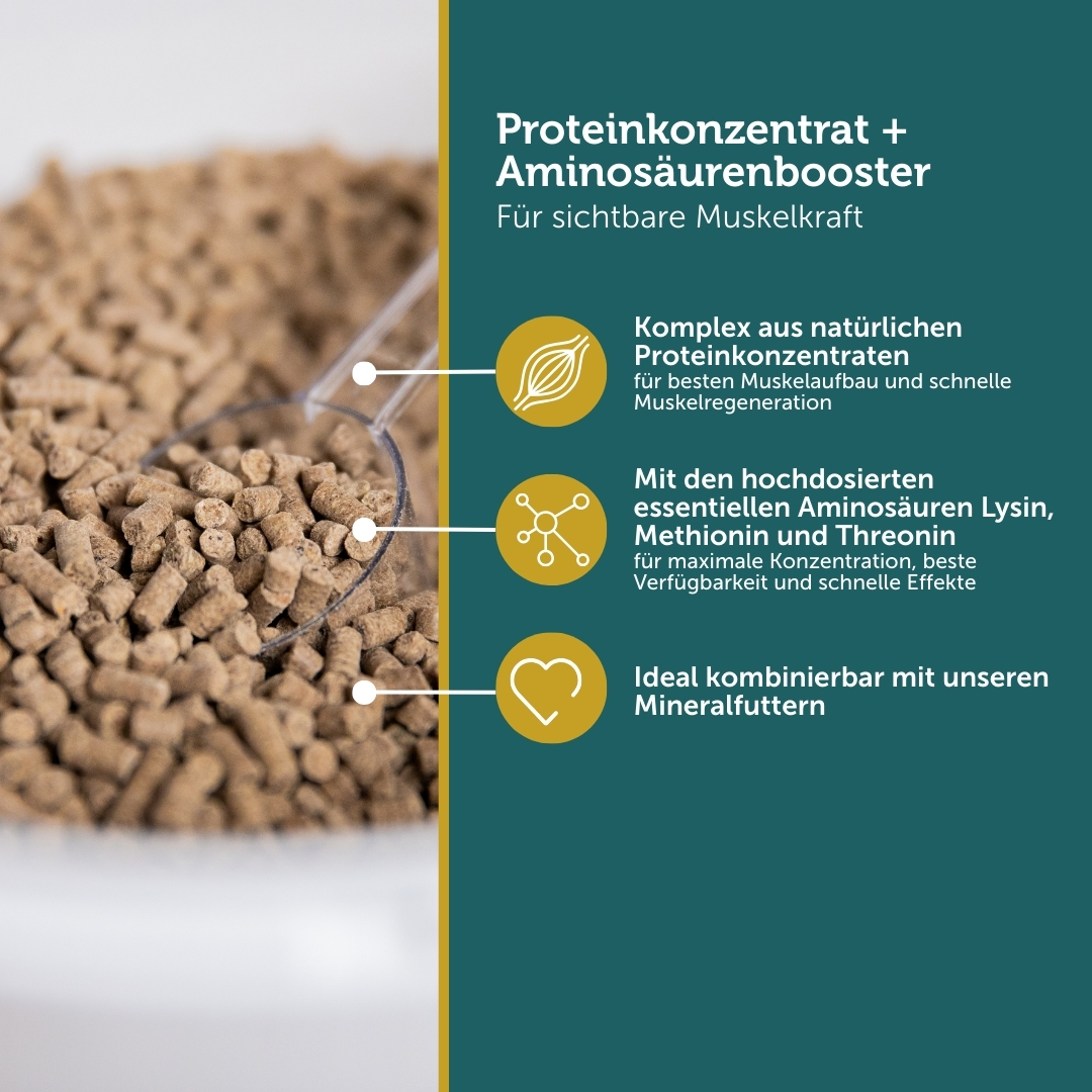 Qualitativ hochwertiges Eiweiß und essentielle Aminosäuren sind wesentlich für den Aufbau der Muskulatur (immer in Kombination mit einer ausreichenden Versorgung an Energie und Mikronährstoffen), eine gute Regeneration der Muskulatur und den gesamten Muskelstoffwechsel. Deshalb ist die Gabe dieser wertvollen Eiweißbestandteile ein wesentlicher Faktor für einen guten Muskelaufbau zum Trainingsbeginn oder wenn es einfach an Muskulatur mangelt. In Kombination mit einer angepassten Bewegung sorgen diese Eiweißstoffe für eine kräftige Muskulatur und unterstützen Leistungsbereitschaft, Regeneration nach Belastung und Losgelassenheit. Somit ist MuskelAmino Komplex auch eine hervorragende Ergänzung der Ration beim Sportpferd und ist selbstverständlich dopingfrei.
