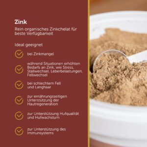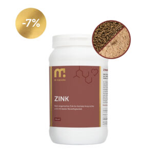 Zink ist einer der essentiellen Mikronährstoffe, der am häufigsten im Mangel ist. Zink ist ein essentieller Cofaktor von mehr als 300 Enzymen und reguliert dadurch die Synthese von Proteinen, Nukleinsäuren, Kohlenhydraten und Lipiden. Zink ist für die Wundheilung, den Säure-Basen-Haushalt, Entgiftung, Biomembrane von Schleimhäuten, Immunkompetenz, antioxidative Prozesse, Sehkraft, Pigmentbildung, Hormonstoffwechsel, Haut, Haar und Hufhorn unentbehrlich. Des Weiteren ist Zink für die Insulinproduktion und – freisetzung essentiell. Ein Mangel an Zink kann zu Mangelsymptomen führen und die normale Funktion des Kohlenhydrat- und Eiweißstoffwechsels stören.