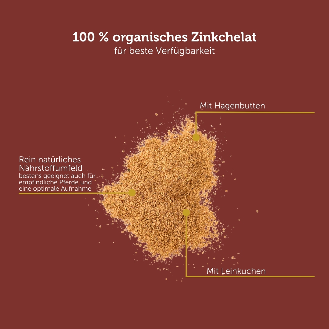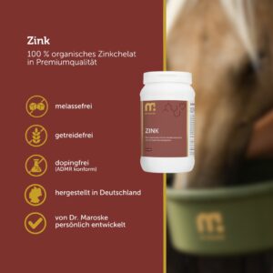 Dr. Maroske ZINK enthält ausschließlich Zink als Aminosäure-Zinkchelat. Diese im Körper hochverfügbare organische Bindungsform ermöglicht eine rasche und optimale Verfügbarkeit im Organismus des Pferdes. Um den Einsatz für alle Pferde und Ponys zu ermöglichen, verwenden wir als Träger kaltgepressten Leinkuchen und verzichten bewusst auf den Einsatz von Füllstoffen, Zuckerverbindungen, chemische Konservierungsstoffe und Aromen. Dadurch ist der Einsatz auch optimal bei stoffwechsel- und reheempfindlichen Pferde sowie bei Unverträglichkeit auf Futtermittel und Allergieempfindlichkeit gewährleistet. Wir verwenden bewusst keine Kräuter, um bei Bedarf eine gezielte phytotherapeutische oder naturheilkundliche Behandlung zu ermöglichen. Die Pulverform und die geringe Futtermenge ermöglicht einen einfachen Einsatz und gute Schmackhaftigkeit.