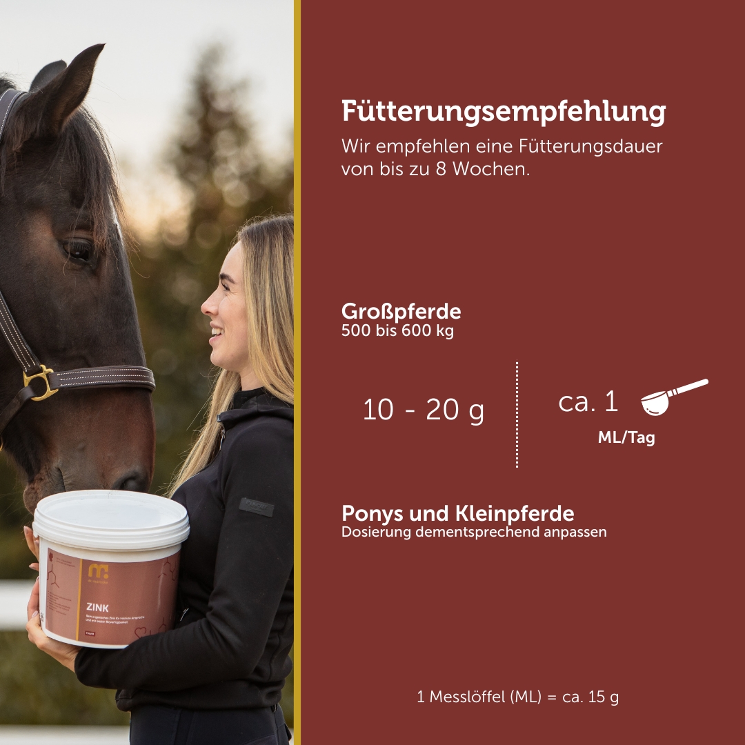 - während Situationen eines erhöhten Bedarfs an Zink (Mehrbedarf), z.B. Stress, Stallwechsel, Leberbelastungen, Ungleichgewichte im Grundfutter